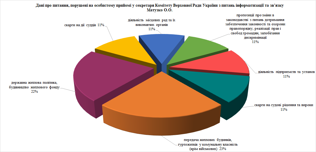 У своїх зверненнях до народного депутата відвідувачі порушували питання житлової політики, забезпечення дотримання законності та охорони правопорядку, реалізації прав і свобод громадян, запобігання дискримінації, діяльності органів місцевого самоврядування, діяльності підприємств та установ.