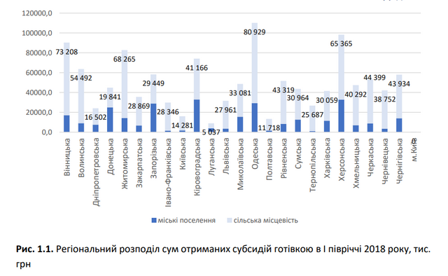 Найбільше субсидій готівкою, призначених для сільської місцевості, у Житомирській та Вінницькій областях – близько 125 та 130 млн грн, найменше – у Луганській (близько 10 млн грн).