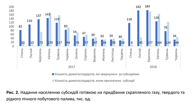 Загальна кількість домогосподарств, які звернулися за субсидіями готівкою на придбання скрапленого газу, твердого та рідкого пічного побутового палива впродовж 2017 – І півріччя 2018 рр., становить 90,6 тисяч одиниць, а кількість тих, що отримали субсидії, – 76,4 тисяч, або 84%.