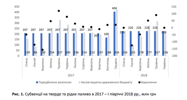 У звіті за результатами дослідження зазначається, що у частині міжбюджетних трансфертів виділяються субвенції на тверде та рідке паливо. У бюджетному розписі на них було передбачено в січні-жовтні 2017 року близько 207 млн грн, у листопаді та грудні 2017 року – 168 та 404 млн грн відповідно. Упродовж січня-червня 2018 року передбачена розписом сума не змінювалася та становила 226 млн грн.