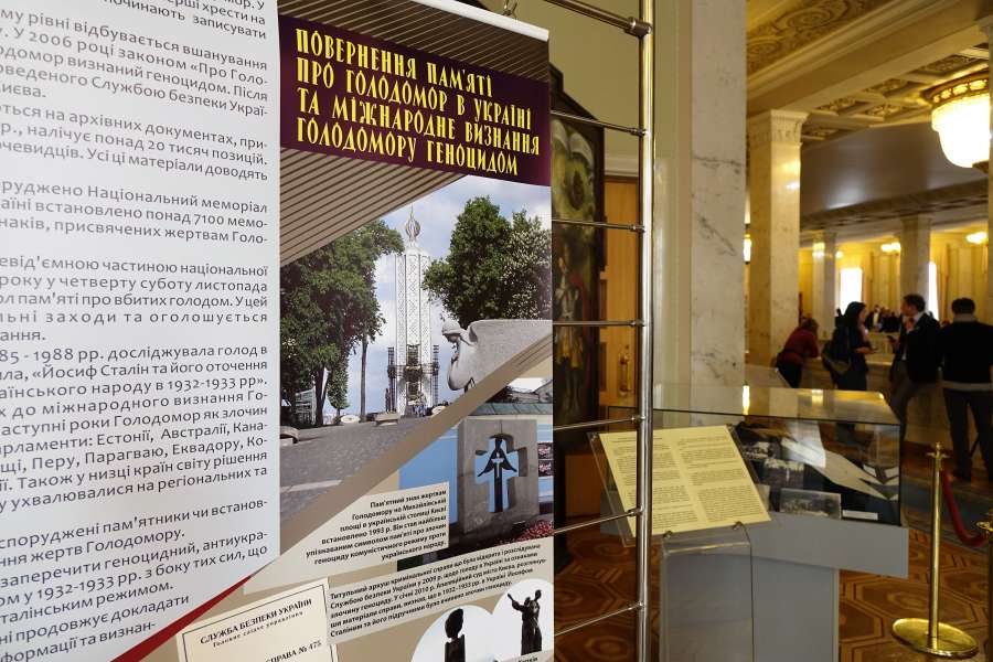 Відвідувачі будинку Верховної Ради України ознайомилися з тематичною експозицією, підготовленою Українським інститутом національної пам’яті, та унікальними архівними документами з галузевого архіву СБУ, що стосуються трагічних сторінок Голодомору 1932-1933 років в Україні.