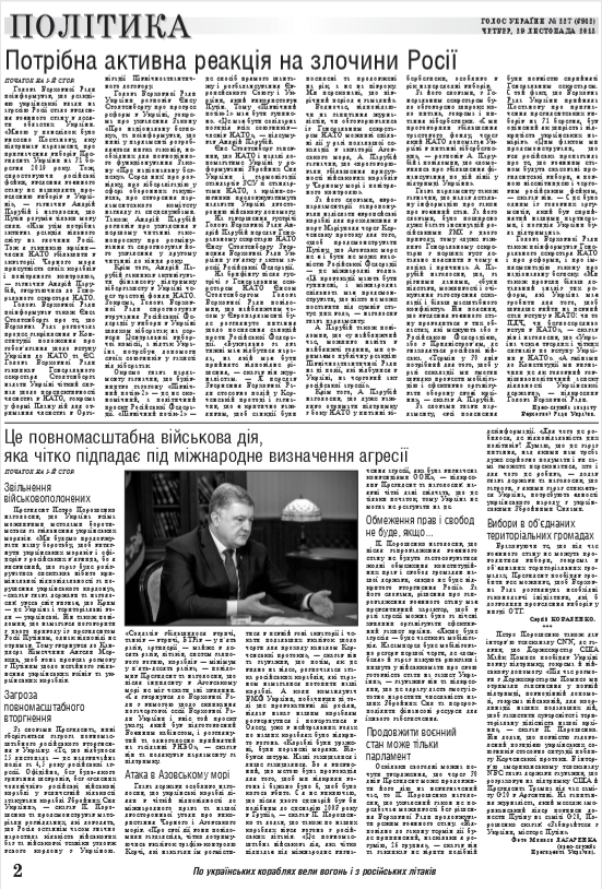 Генеральний секретар НАТО висловив занепокоєння діями Російської Федерації у Чорному і Азовському морях. Також Столтенберг зазначив, що НАТО ніколи не визнає незаконну анексію Криму. Голова Верховної Ради України поінформував Єнса Столтенберга про напад, вчинений російськими військовими кораблями на українські кораблі у Керченській протоці. "Якщо у попередні роки Росія приховувала злочинні дії своїх військових під час анексії Криму та на Донбасі, постійно маскуючи своїх військових під так звану "кримську самооборону" чи під "місцевих шахтарів", то напад на українські кораблі у Керченській протоці Росія здійснила відкрито, не ховаючись, під російськими прапорами", - зазначив Андрій Парубій. (читайте у «Голосі України» на 1-2 стор. >>> article/310686)