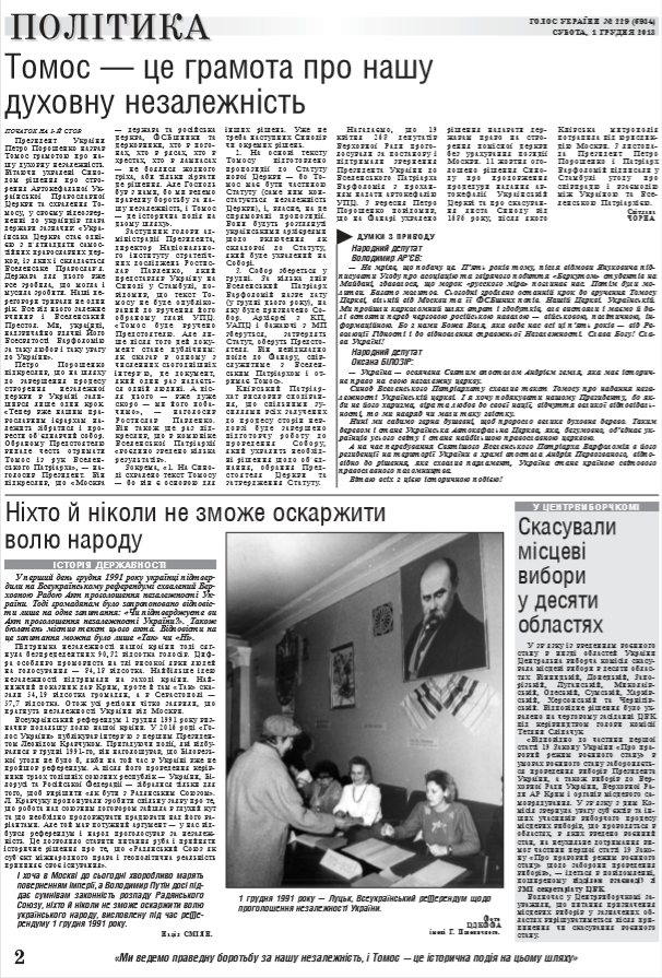 У перший день грудня 1991 року українці підтвердили на Всеукраїнському референдумі схвалений Верховною Радою Акт проголошення незалежності України. Тоді громадянам було запропоновано відповісти лише на одне запитання: «Чи підтверджуєте ви Акт проголошення незалежності України?». Також бюлетень містив текст цього акту. Відповісти на це запитання можна було лише «Так» чи «Ні». (читайте у «Голосі України» на 2 стор. >>> article/310827)