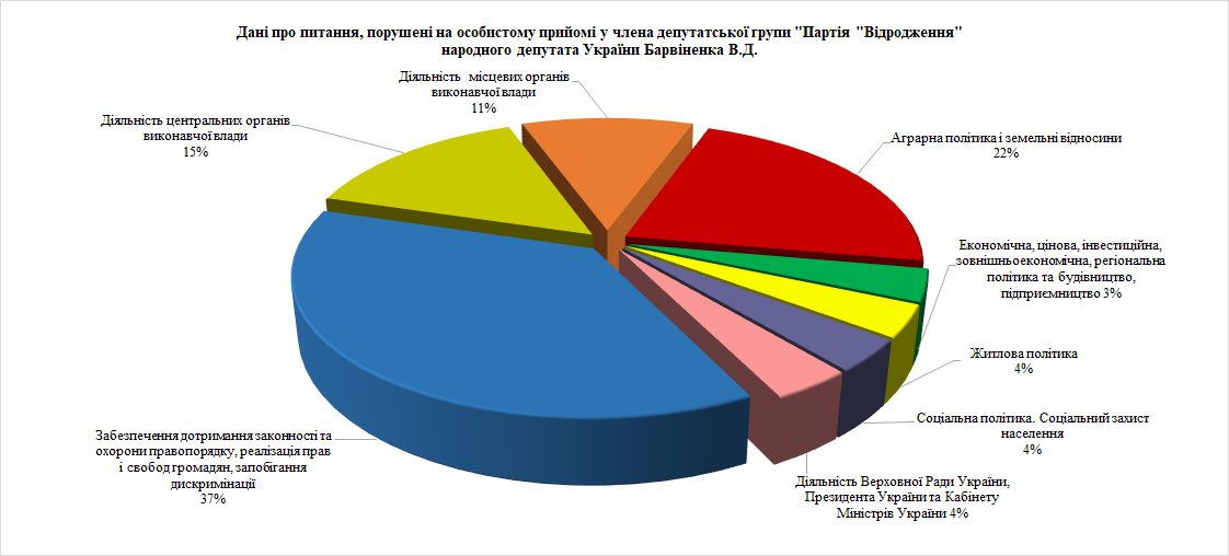 Під час особистого прийому відвідувачі порушили 27 питань. Найактуальнішими з них виявилися питання забезпечення дотримання законності та охорони правопорядку, реалізації прав і свобод громадян, запобігання дискримінації, аграрної політики і земельних відносин, центральних органів виконавчої влади, діяльності місцевих органів виконавчої влади.