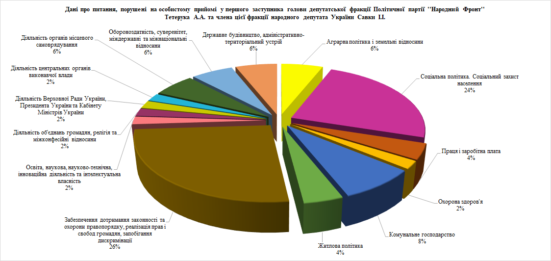 Під час особистого прийому відвідувачі порушили 50 питань. Серед них переважали питання забезпечення дотримання законності та охорони правопорядку, реалізації прав і свобод громадян, запобігання дискримінації, соціальної політики та соціального захисту населення, комунального господарства.