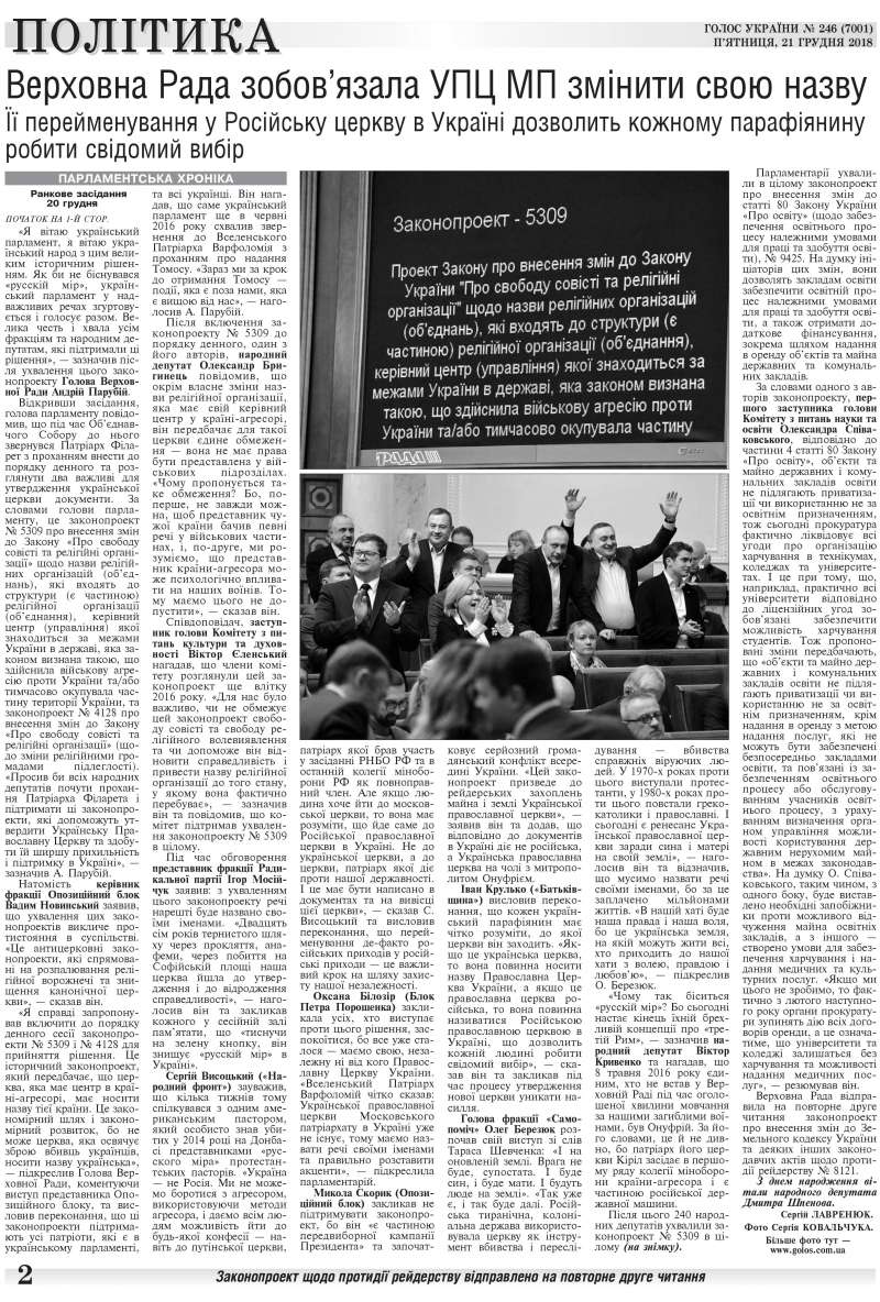 Верховна Рада ухвалила в цілому законопроект № 5309, який зобов’язує Українську православну церкву Московського патріархату змінити свою назву, вказавши у ній свою приналежність до Російської православної церкви.