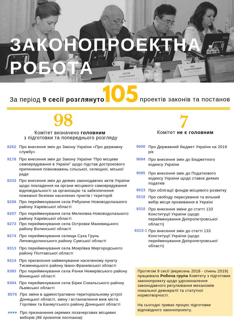 Протягом дев’ятої сесії діяла Робоча група Комітету з підготовки законопроекту щодо удосконалення законодавчого регулювання механізмів локальної демократії та статутної нормотворчості. На сьогодні Робоча група за участю народних депутатів, представників центральних органів виконавчої влади, провідних асоціацій органів місцевого самоврядування, неурядових організацій, науковців та експертів працює над розробкою законопроекту за результатами своєї роботи.