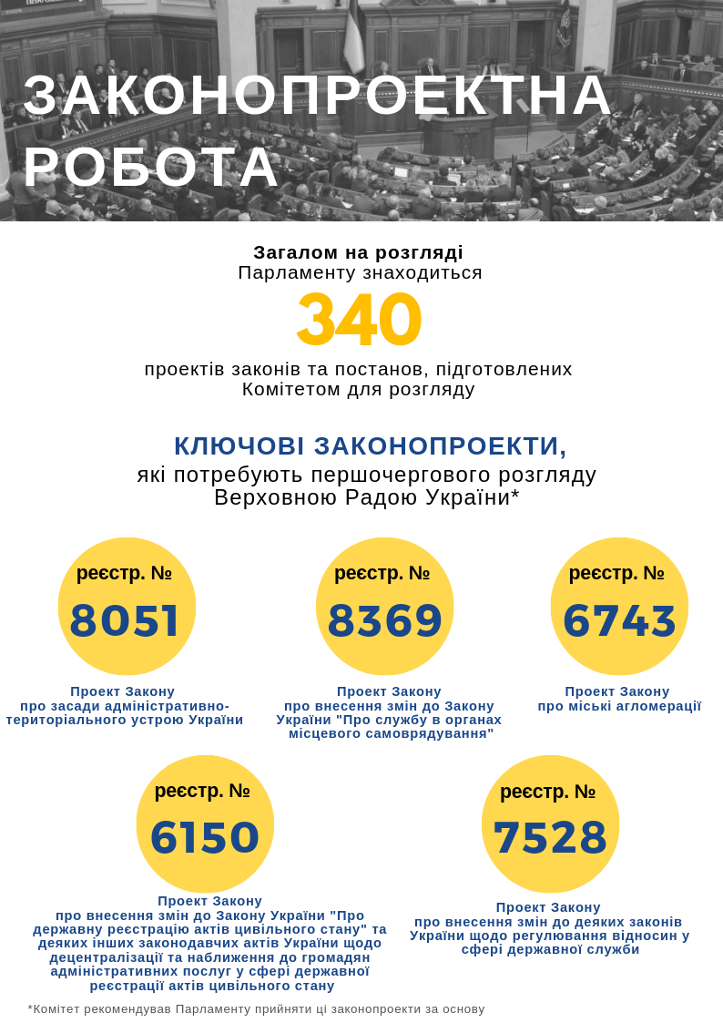 Загалом на розгляді Верховної Ради наразі знаходиться 340 проектів законів та постанов, які були підготовлені Комітетом для розгляду Парламентом протягом попередніх сесій. Деякі з цих проектів потребують особливої уваги законодавчого органу з огляду на їх ключову роль у подальшому впровадженні місцевого самоврядування та територіальної організації влади в Україні. Зокрема, йдеться про проект Закону про засади адміністративно-територіального устрою України №8051, яким пропонується унормувати основні засади адміністративно-територіального устрою України, порядок утворення, ліквідації, встановлення і зміни меж адміністративно-територіальних одиниць, а також проект Закону про міські агломерації №6743, який передбачає удосконалення регіональної політики з урахуванням наслідків урбанізації.