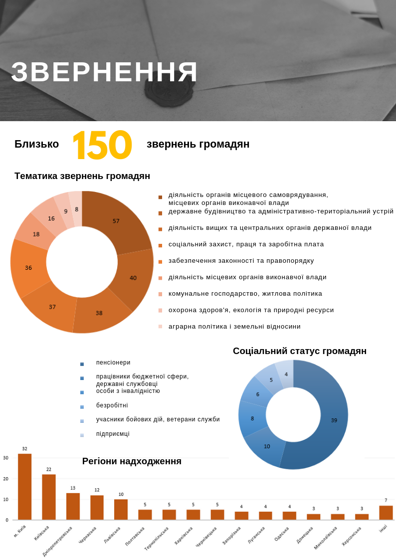 За період з вересня 2018 року по січень 2019 року до Комітету надійшло більше 1500 звернень (заяв, скарг, повідомлень, пропозицій, запитів, електронних петицій) від усіх категорій заявників (юридичні особи, органи державної влади і місцевого самоврядування, їх посадові особи, громадяни), у тому числі від громадян - 174. Тематика звернень охоплювала широке коло питань і в деяких випадках виходила за межі предмету відання Комітету.