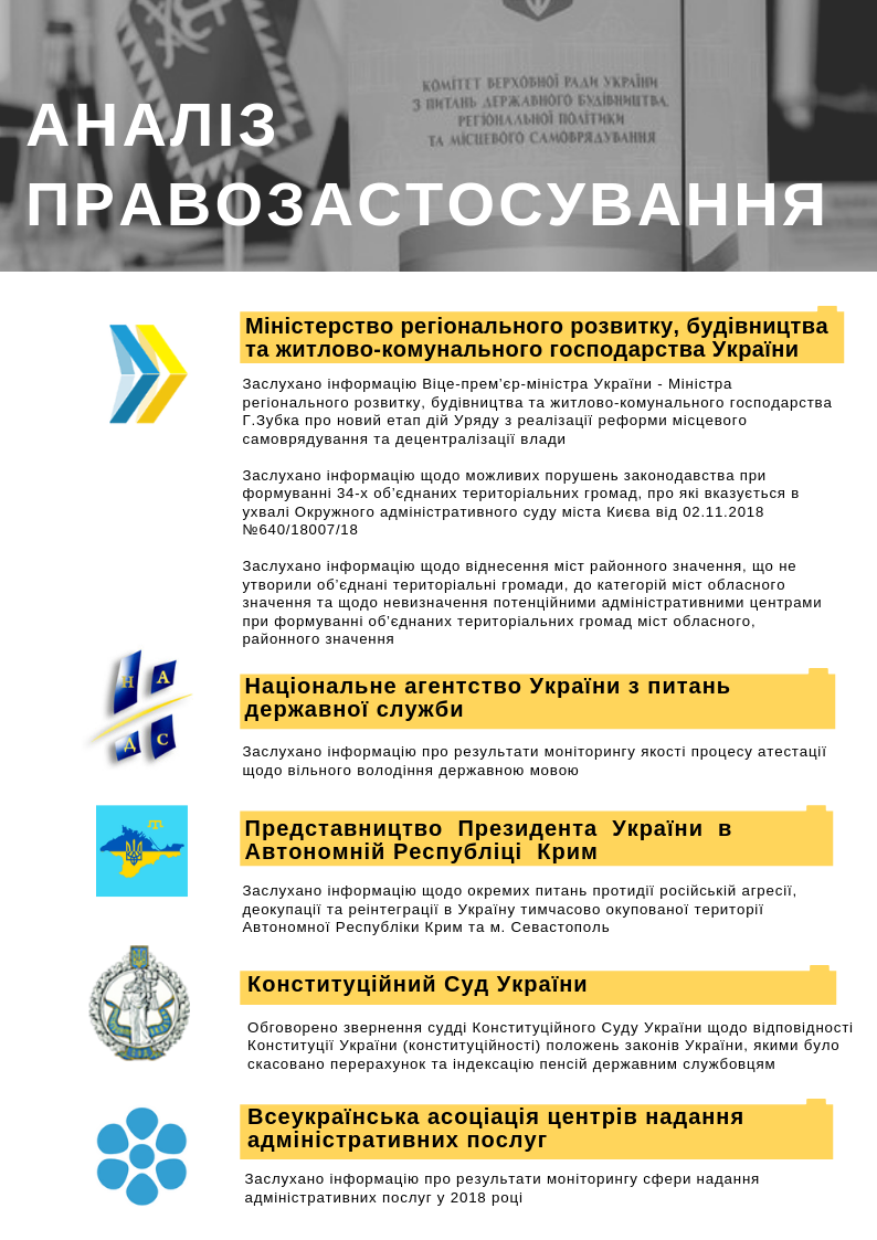Комітет з питань державного будівництва, регіональної політики та місцевого самоврядування протягом сесії здійснював аналіз практики застосування законодавчих актів, віднесених до предмету його відання, у діяльності органів державної влади та органів місцевого самоврядування, їх посадових осіб, оперативно реагував на проблеми правозастосування та надавав висновки і роз’яснення у відповідності до положень статей 14, 24-331 Закону України «Про комітети Верховної Ради України».