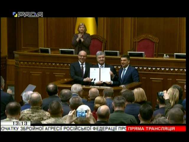 У ході свого виступу Глава держави оголосив про рішення підписати закон про внесення змін до Конституції України щодо стратегічного курсу держави на набуття повноправного членства України в Європейському Союзі та в Організації Північноатлантичного договору. Президент України запросив Голову Верховної Ради України Андрія Парубія та прем’єр-міністра Володимира Гройсмана долучитися до церемонії підписання документа: «Прошу Голову Верховної Ради Андрія Парубія та Прем’єр-міністра Володимира Гройсмана у присутності Президента Європейської Ради – одного з очільників Європейського Союзу, друга України Дональда Туска - засвідчити єдність усіх гілок влади у питанні європейської та євроатлантичної інтеграції».