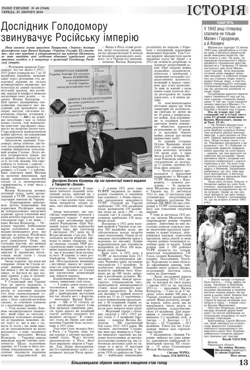 Нова книжка голови правління Товариства «Знання» доктора філософських наук Василя Кушерця «Україна: Голгофа XX століття», яка вже передана в університетські та публічні бібліотеки, не лише наводить нові свідчення вбивства українських селян штучним голодом, а й звинувачує в організації Голодомору Російську імперію. — Розуміння природи Голодомору, під час якого у 1932—1933 роках померли від 7 до 10 мільйонів українців, можливе лише через розуміння суті імперської держави на засадах великоруського шовінізму, що базується на давній експансіоністській традиції, яка розчиняє народи й конфесії навколо нагнітання своєї величі, — зазначає Василь Кушерець (читайте у «Голосі України» на 13 стр. >>> article/314214)
