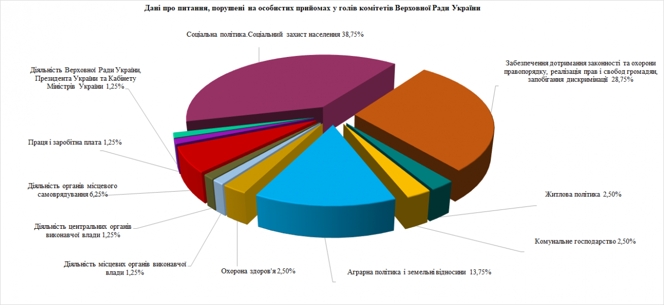 Найактуальнішими для відвідувачів приймальні Верховної Ради України виявилися питання соціальної політики та соціального захисту населення – 31, або 38,75 %; забезпечення дотримання законності та охорони правопорядку, реалізації прав і свобод громадян, запобігання дискримінації – 23, або 28,75 %; аграрної політики і земельних відносин – 11, або 13,75 %; діяльності органів місцевого самоврядування – п’ять, або 6,25 %.