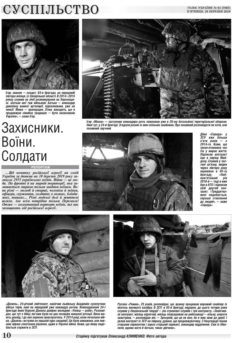 ..Від початку російської агресії на сході України за даними на 18 березня 2019 року загинуло 2955 українських воїнів. Війна — це люди. На фронті й на мирній території, яка залишається мирною тільки завдяки воїнам. Вони різні — молоді й старші, чоловіки й жінки, офіцери, сержанти, солдати; в окопах, бліндажах, танках... Різні людські долі й життєві шляхи. Але всім потрібна тільки Перемога! Отже — колективний портерт воїнів, які нас захищають від російської агресії. (читайте у «Голосі України» на 1,10 стр. >>> article/315260)