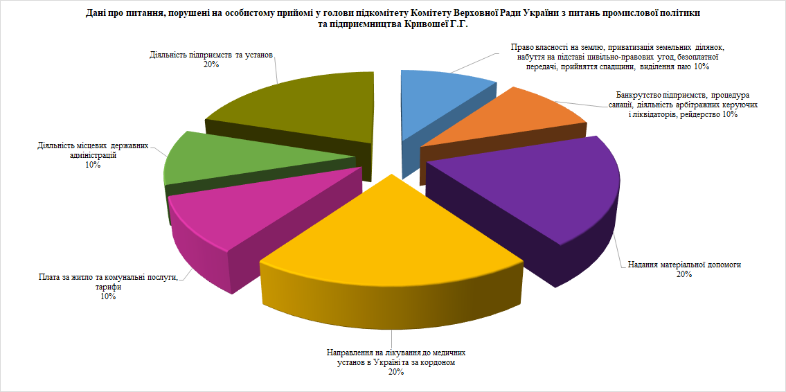 У своїх зверненнях до народного депутата України відвідувачі порушували питання економічної, цінової, інвестиційної, зовнішньоекономічної, регіональної політики та будівництва, підприємництва, діяльності підприємств та установ, соціальної політики та соціального захисту населення, охорони здоров'я, аграрної політики і земельних відносин, комунального господарства, діяльності місцевих органів виконавчої влади.