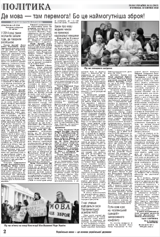 "Сьогодні, у Чистий четвер, ми ухвалюємо ще один доленосний закон для відновлення історичної справедливості, утвердження української ідентичності. Це закон про українську мову як державну! Українська держава має державну мову - це українська мова! Ми, український парламент, приймаючи закон про функціонування української мови як державної, виконуємо свій обов'язок!" - сказав він та підкреслив, що українська мова - це наша наймогутніша зброя. "Імперська Росія завжди робила все, щоби вибити її нам із рук. (читайте у «Голосі України» на 1-2 стор. >>> article/316482)