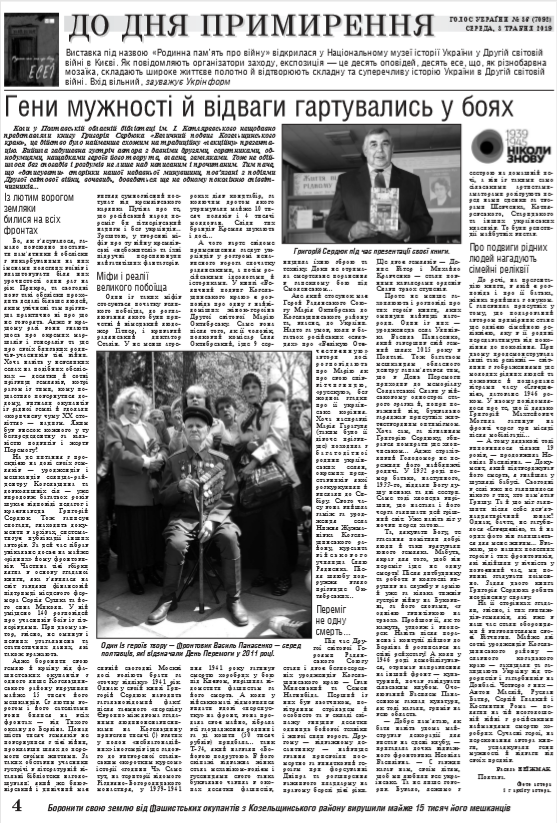 Коли у Полтавській обласній бібліотеці ім. І. Котляревського нещодавно представляли книгу Григорія Сердюка "Величний подвиг Козельщинського краю", це дійство було найменше схожим на традиційну "лекційну" презентацію. Вийшла задушевна зустріч автора з давніми друзями, соратниками, однодумцями, нащадками героїв його твору та, власне, земляками. Тож не обійшлося без спогадів і роздумів не лише над написаним і прочитаним. Тим паче, що "дописувати" сторінки нашої недавньої минувшини, пов'язані з подіями Другої світової війни, вочевидь, доведеться ще не одному поколінню співвітчизників... (читайте у «Голосі України» на 4 стор. >>> article/316753)