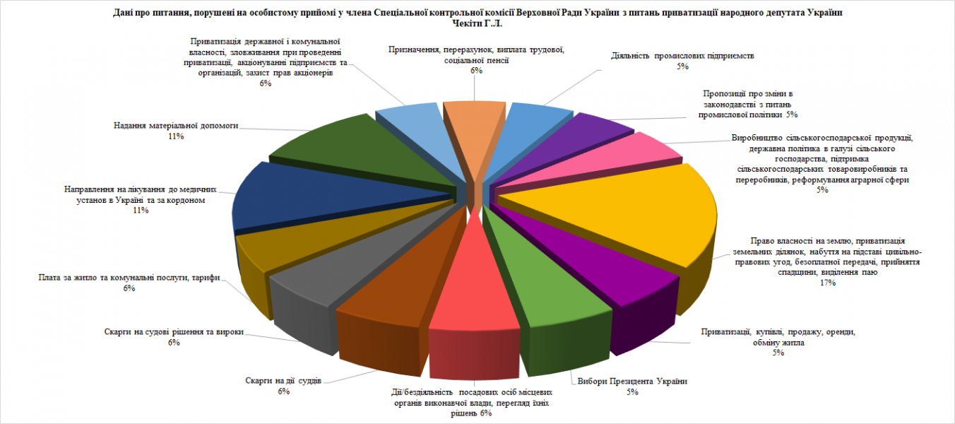 Під час особистого прийому відвідувачі порушили 18 питань. Серед них переважали питання аграрної політики і земельних відносин, соціальної політики та соціального захисту населення, промислової політики, забезпечення дотримання законності та охорони правопорядку, реалізації прав і свобод громадян, запобігання дискримінації, охорони здоров’я.