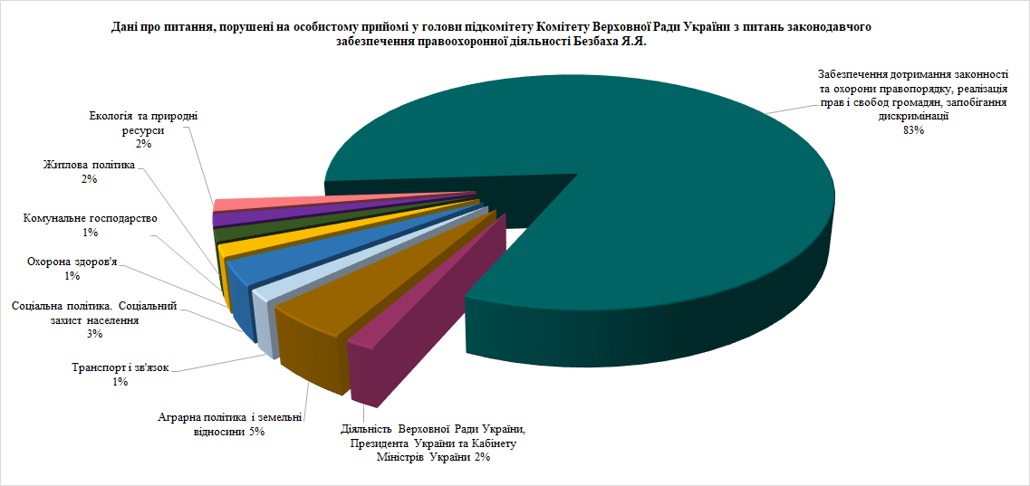 Під час особистого прийому відвідувачі порушили 65 питань. Серед них переважали питання забезпечення дотримання законності та охорони правопорядку, реалізації прав і свобод громадян, запобігання дискримінації, соціальної політики та соціального захисту населення, аграрної політики і земельних відносин.