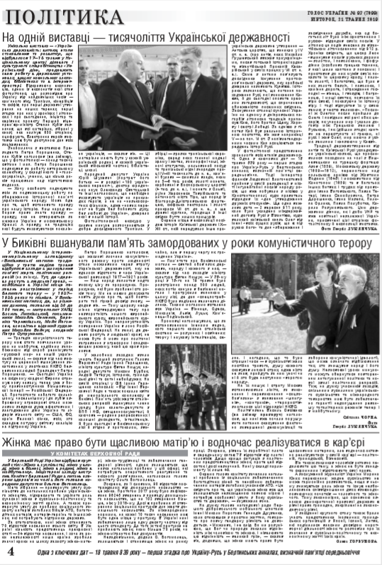 Унікальна виставка - "Українська державність: витоки, етапи становлення та розвитку", що відбувалася 17-18 травня у Національному центрі ділового і культурного співробітництва "Український дім", продовжить свою роботу в державних установах, вищих навчальних закладах, бібліотеках та в інтернет- просторі. Відкриваючи експозицію, одним із експонатів якої став фотолітопис, що розповідає про Україну від найдавніших часів - кам'яного віку, Трипілля, кімерійців та скіфів, про перші державні утворення на наших теренах, перші згадки про них у хроніках і літописах і про сьогодення, ініціатор та керівник проекту Перший віце-прем'єр-міністр Степан Кубів зазначив, що всі матеріали, зібрані у книзі, яка налічує 650 сторінок, оцифрують. Електронна версія виставки має бути доступною для всіх зацікавлених. (читайте у «Голосі України» на 4 стор. >>> article/317261)