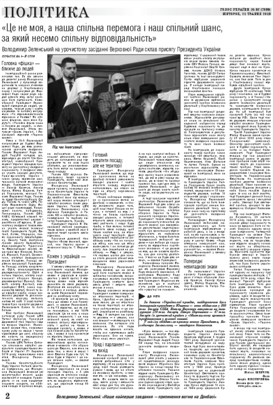 Учора на спеціальному урочистому засіданні Верховної Ради України відбулася церемонія складання присяги новообраним Президентом України Володимиром Зеленським перед українським народом. Нинішня інавгурація відбулася дуже емоційно і з очікуваними "фішками", новаціями, яких не було на церемоніях попередніх Президентів. А в інавгураційній промові новий глава держави заявив, що розпускає Верховну Раду України восьмого скликання. Головна "фішка" - ближче до людей. (читайте у «Голосі України» на 1-2 стор. >>> article/317238)