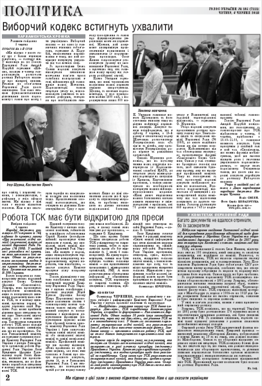 "Ми підемо з цього залу ще з більш великою ганьбою", - застеріг він. У відповідь на це Голова Верховної Ради Андрій Парубій зауважив: "Дійсно, планую в четвер запропонувати розпочати розгляд Виборчого кодексу про відкриті списки. Вважаю це обов'язком Верховної Ради цього скликання. Так само вважаю фундаментальними рішеннями цього парламенту і закон про мову, і про освіту, і церковні закони, і декомунізацію, і реформи у всіх сферах життя. Ми підемо з цієї зали з високо піднятою головою. Нам є що сказати українцям". Виборчий кодекс - це одне із заключних великих зобов'язань, зауважив А. Парубій, висловивши переконання в тому, що цей документ встигнуть ухвалити під час літньої сесії. (читайте у «Голосі України» на 1-2 стор. >>> article/317943)