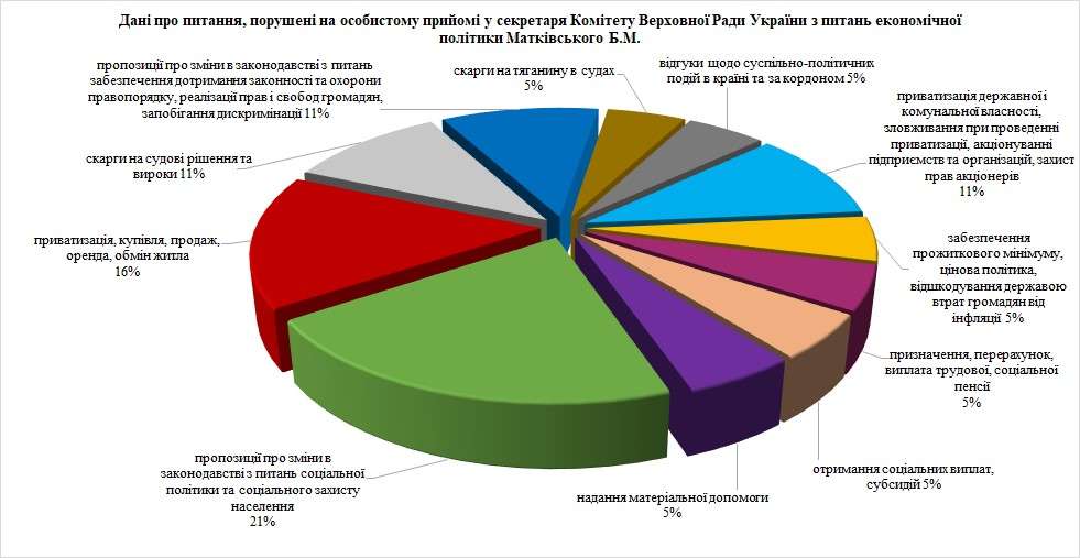 У своїх зверненнях до народного депутата відвідувачі порушували питання соціальної політики та соціального захисту населення, економічної, цінової, інвестиційної, зовнішньоекономічної, регіональної політики та будівництва, підприємництва, забезпечення дотримання законності та охорони правопорядку, реалізації прав і свобод громадян, запобігання дискримінації, житлової політики, діяльності Верховної Ради України, Президента України та Кабінету Міністрів України.
