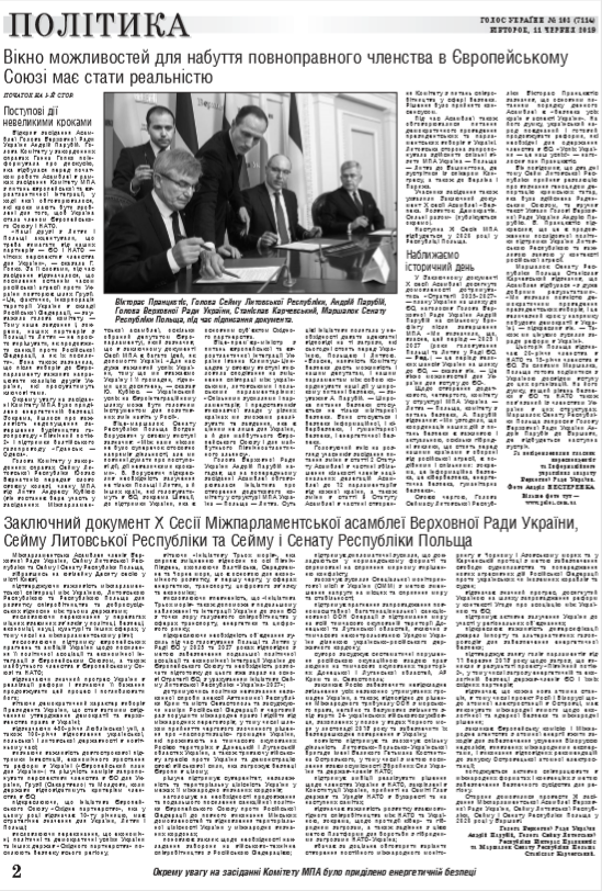 8 червня у Верховній Раді України відбулася Х Сесія Міжпарламентської асамблеї Верховної Ради України, Сейму Литовської Республіки та Сейму і Сенату Республіки Польща. Поступові дії невеликими кроками