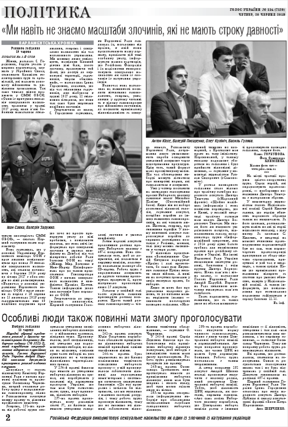 На початку ранкового засідання, під час якого зареєструвалися 307 народних депутатів, із заявою виступила Перший заступник Голови Верховної Ради Ірина Геращенко. Політик привернула увагу до надзвичайно болючої та делікатної теми - 19 червня у світі відзначається день боротьби з сексуальним насильством в умовах конфлікту. "Ця дата була проголошена в Резолюції Генасамблеї ООН від 19 червня 2015 року з метою залучення додаткової уваги до проблеми сексуального насильства в умовах різних конфліктів", - зауважила І. Геращенко, додавши: "У зв'язку з конфліктом на Донбасі і окупацією Криму ми навіть не знаємо масштаби злочинів, які не мають строку давності". (читайте у «Голосі України» на 1-2 стор. >>> article/318462)
