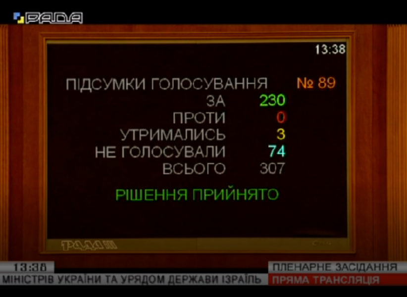230 голосами прийнято в цілому проект Закону про ратифікацію Угоди про вільну торгівлю між Кабінетом Міністрів України та Урядом Держави Ізраїль №0223.