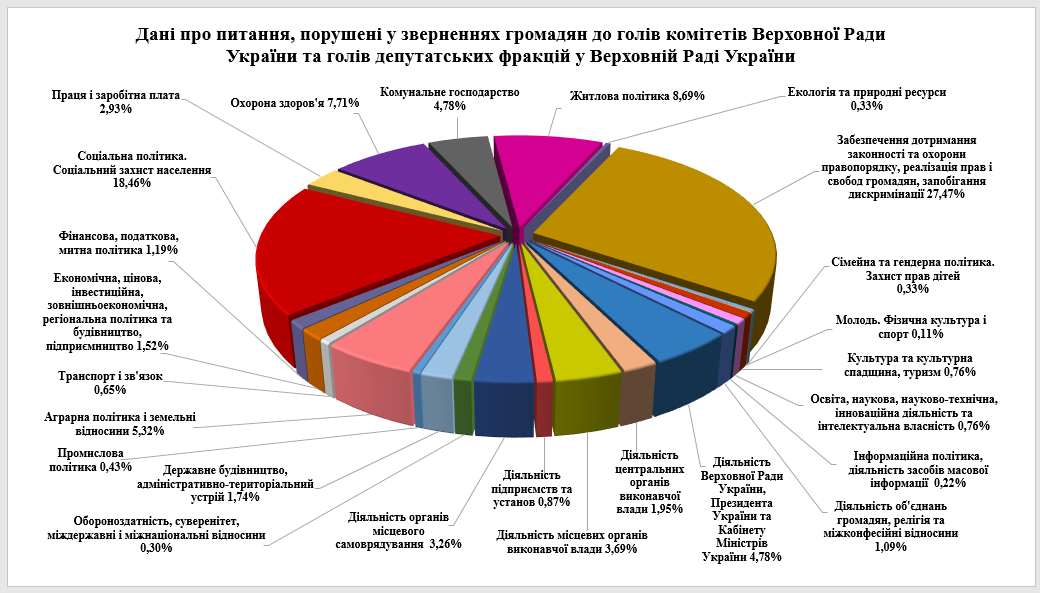 Усього під час роботи десятої сесії Верховної Ради України восьмого скликання на особистих прийомах голів парламентських комітетів, голів депутатських фракцій у Верховній Раді України відвідувачами порушено 921 питання. Найактуальнішими серед них залишаються питання забезпечення дотримання законності та охорони правопорядку, реалізації прав і свобод громадян, запобігання дискримінації – 253, або 27,4% загальної кількості питань, порушених під час особистих прийомів. У переважній більшості звернень даного тематичного спрямування громадяни скаржилися на дії працівників правоохоронних органів – 44 (17,4%).