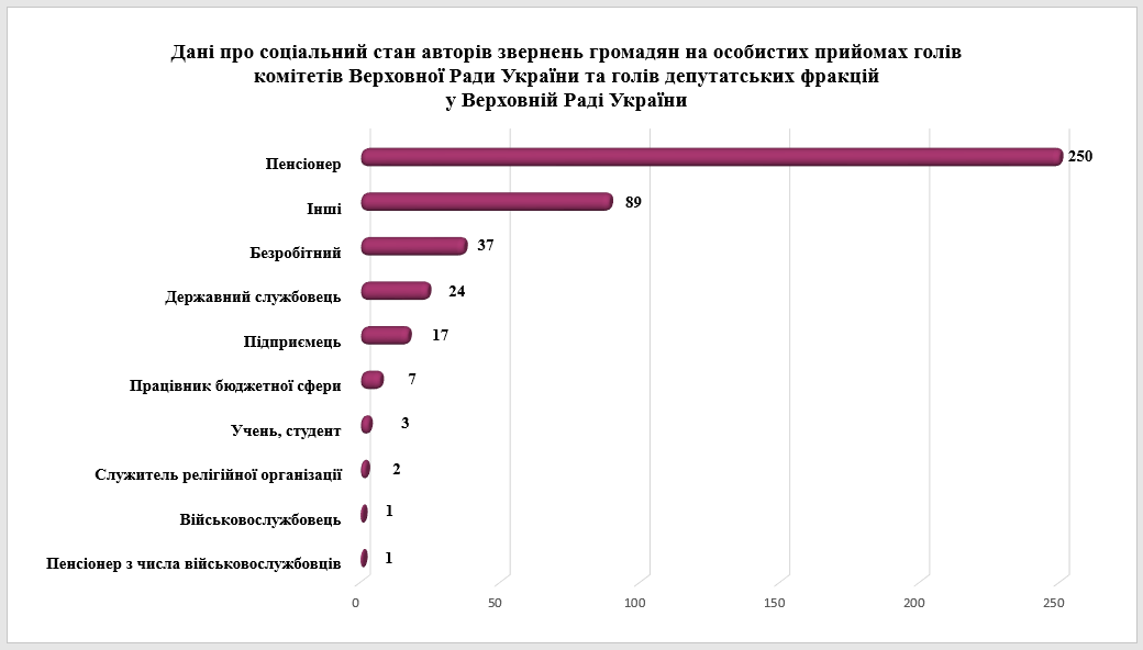 соціальний стан, найчастіше зверталися – пенсіонери (250 звернень, або 58,8% загальної