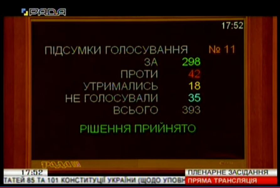 Верховна Рада прийняла в цілому Постанову «Про внесення до порядку денного другої сесії Верховної Ради та направлення до Конституційного Суду для одержання висновку щодо відповідності вимогам Конституції України проекту Закону «Про внесення змін до статей 85 та 101 Конституції України (щодо уповноважених Верховної Ради України)» (№1016). Законопроект підтримали 298 народних депутатів.