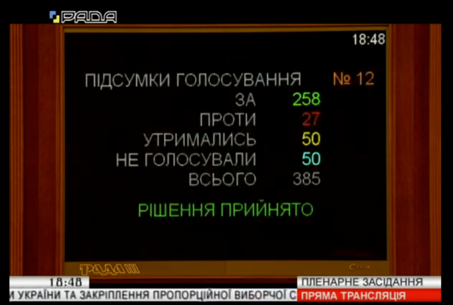 Верховна Рада 258 голосами підтримала в цілому Постанову «Про внесення до порядку денного другої сесії Верховної Ради та направлення до Конституційного Суду для одержання висновку щодо відповідності вимогам Конституції України проекту Закону «Про внесення змін до статей 76 та 77 Конституції України (щодо зменшення конституційного складу Верховної Ради України та закріплення пропорційної виборчої системи)» (№1017).
