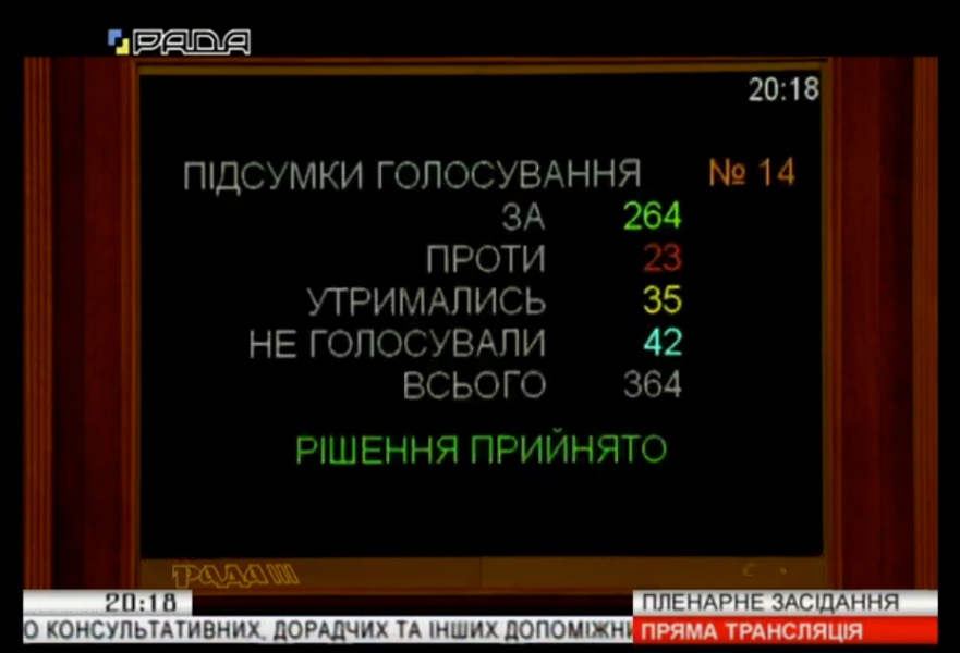 Верховна Рада 264-ма голосами підтримала в цілому Постанову «Про внесення до порядку денного другої сесії Верховної Ради та направлення до Конституційного Суду для одержання висновку щодо відповідності вимогам Конституції України проекту Закону «Про внесення зміни до статті 85 Конституції України (щодо консультативних, дорадчих та інших допоміжних органів Верховної Ради України)» (№1028).