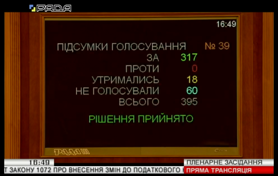 Народні депутати ухвалили в першому читанні за основу проект Закону «Про внесення змін до Податкового кодексу України щодо подання єдиної звітності з єдиного внеску на загальнообов'язкове державне соціальне страхування і податку на доходи фізичних осіб». За дане рішення проголосували 317 парламентаріїв. Строки підготовки до другого читання скорочено на половину.