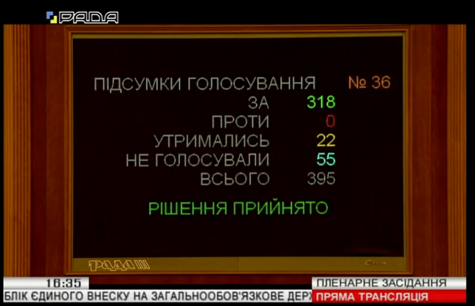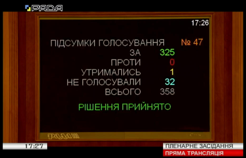 Постанову «Про Заяву Верховної Ради України про невизнання легітимності так званих місцевих виборів на тимчасово окупованих територіях України - Автономна Республіка Крим та м. Севастополь» підтримали 325 народних депутатів.