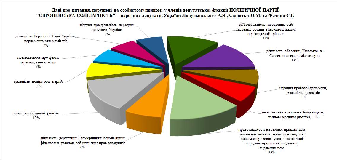 У своїх зверненнях до народних депутатів України відвідувачі найчастіше порушували питання забезпечення дотримання законності та охорони правопорядку, реалізації прав і свобод громадян, запобігання дискримінації, діяльності Верховної Ради України, Президента України та Кабінету Міністрів України, аграрної політики і земельних відносин, діяльності місцевих органів виконавчої влади та органів місцевого самоврядування.