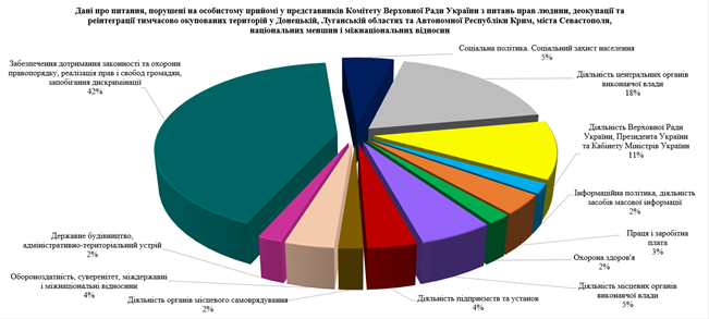 Під час особистого прийому відвідувачі порушили 55 питань. Найактуальнішими з них виявилися питання забезпечення дотримання законності та охорони правопорядку, реалізації прав і свобод громадян, запобігання дискримінації, діяльності центральних органів виконавчої влади, діяльності Верховної Ради України, Президента України та Кабінету Міністрів України, соціальної політики та соціального захисту населення, діяльності місцевих органів виконавчої влади.