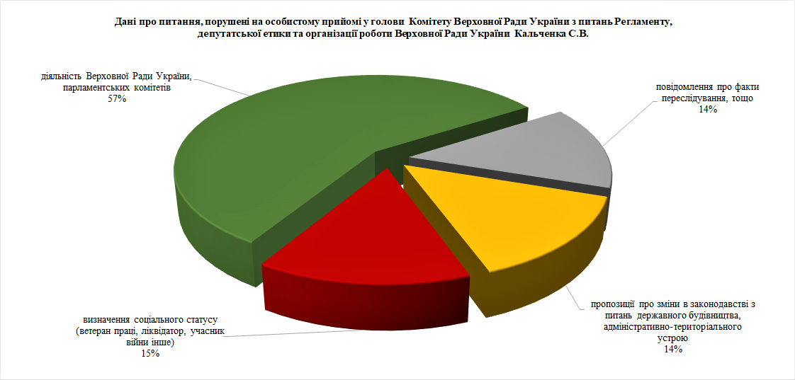 Під час особистого прийому відвідувачі порушували питання діяльності Верховної Ради України, Президента України та Кабінету Міністрів України, соціальної політики та соціального захисту населення, державного будівництва, адміністративно-територіального устрою, забезпечення дотримання законності та охорони правопорядку, реалізації прав і свобод громадян, запобігання дискримінації.