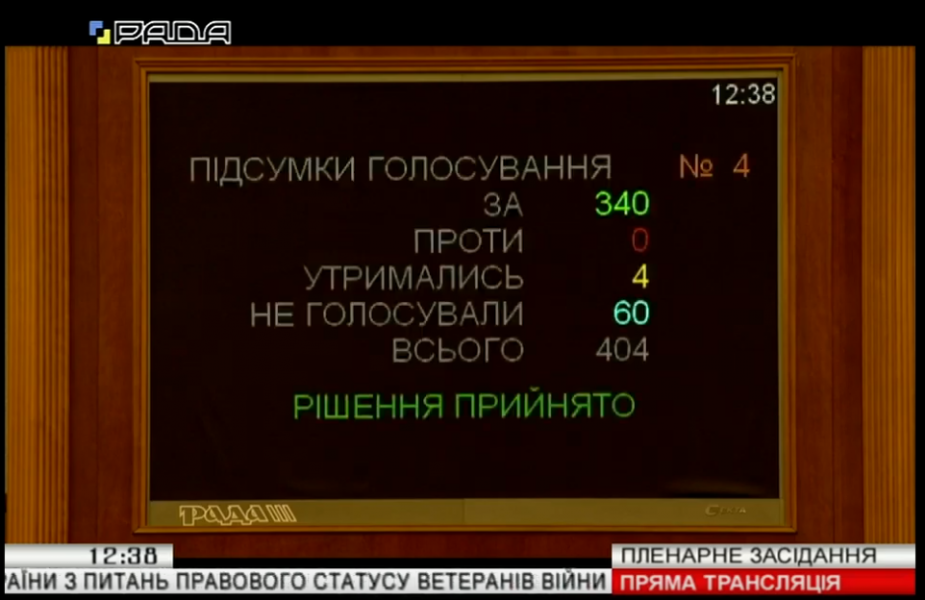 Верховна Рада 340 голосами підтримала проект Постанови «Про утворення Тимчасової спеціальної комісії Верховної Ради України з питань правового статусу ветеранів війни».