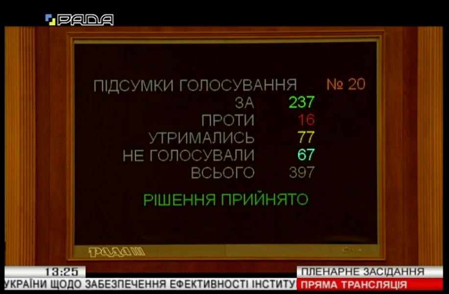 У другому читанні та в цілому з техніко-юридичними правками проект Закону «Про внесення змін до деяких законодавчих актів України щодо забезпечення ефективності інституційного механізму запобігання корупції» підтримали 237 народних депутатів.