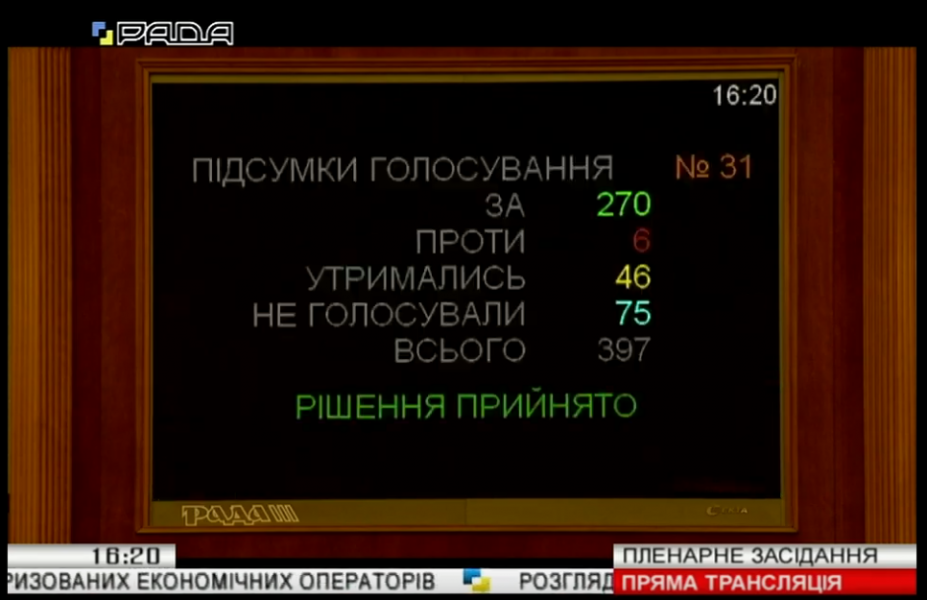 Проект Закону «Про внесення змін до Митного кодексу України щодо деяких питань функціонування авторизованих економічних операторів» у другому читанні і в цілому з техніко-юридичними правками підтримали 270 парламентаріїв.