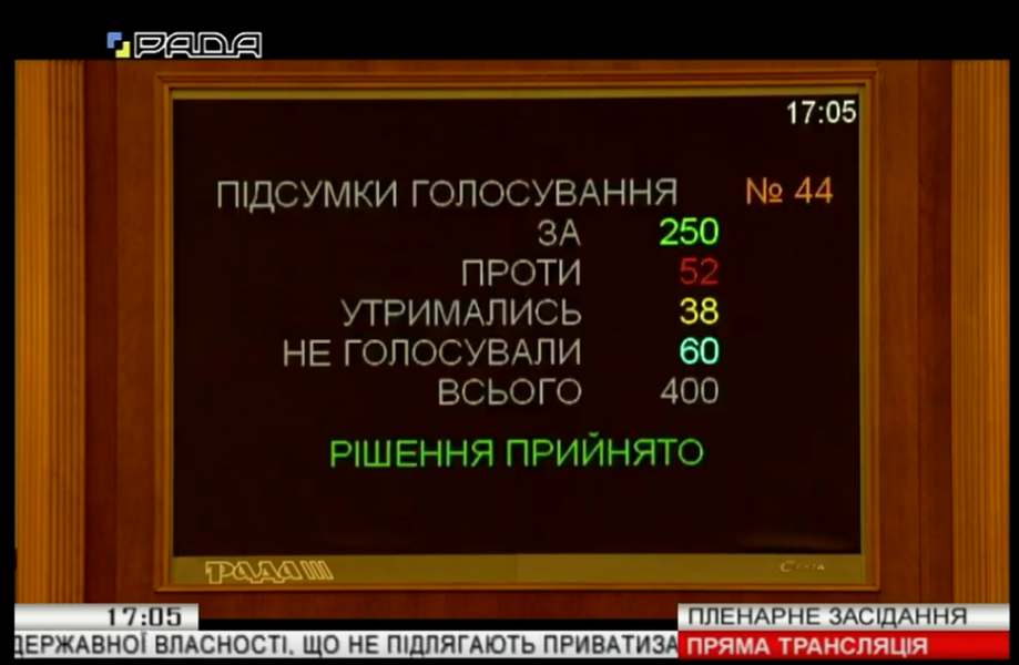 Верховна Рада 250 голосами підтримала проект Закону «Про визнання таким, що втратив чинність, Закону України "Про перелік об'єктів права державної власності, що не підлягають приватизації" у другому читанні і в цілому.