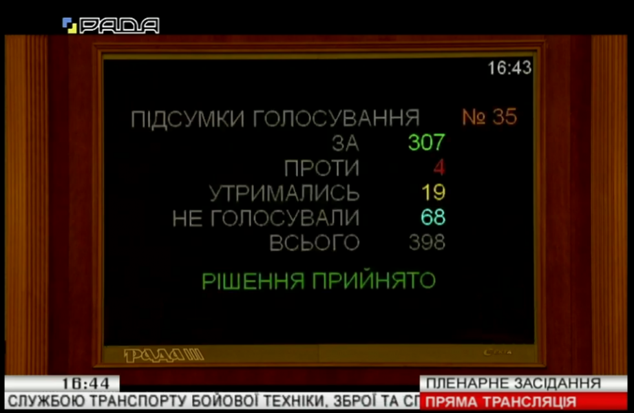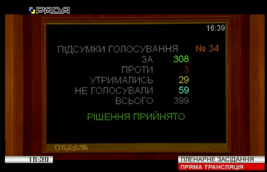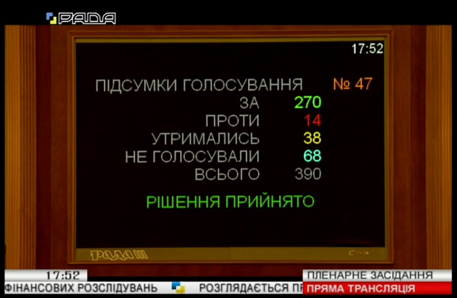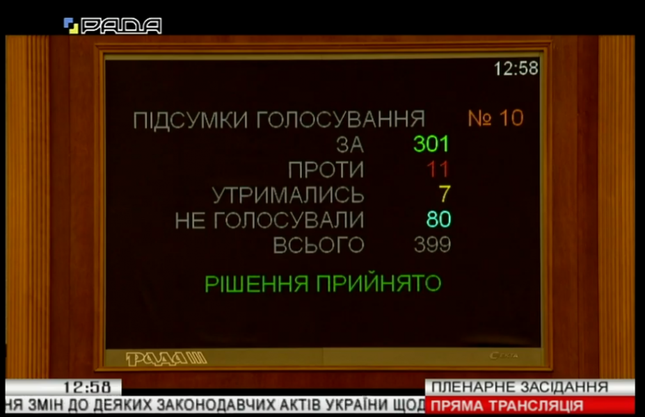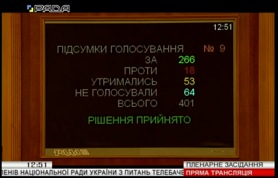 Проект Закону «Про внесення змін до Закону України "Про Національну раду України з питань телебачення і радіомовлення" щодо вдосконалення процедури звільнення та призначення членів Національної ради України з питань телебачення і радіомовлення» підтримали у другому читанні і в цілому 266 парламентаріїв.