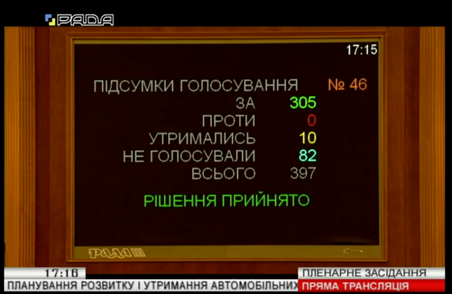 Проект Закону «Про внесення змін до Бюджетного кодексу України щодо запровадження середньострокового планування розвитку і утримання автомобільних доріг загального користування» 305 голосами ухвалено за основу.