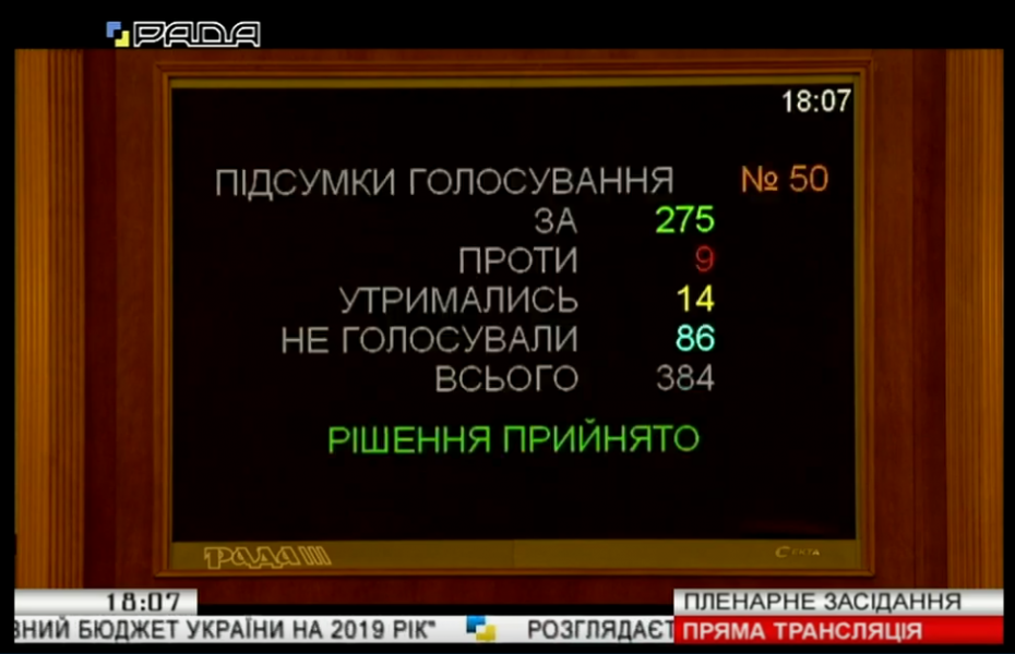 За основу і в цілому з пропозиціями профільного Комітету і техніко-юридичними правками ухвалений проект Закону «Про внесення змін до Закону України "Про Державний бюджет України на 2019 рік" №2039. За таке рішення проголосували 275 парламентаріїв.