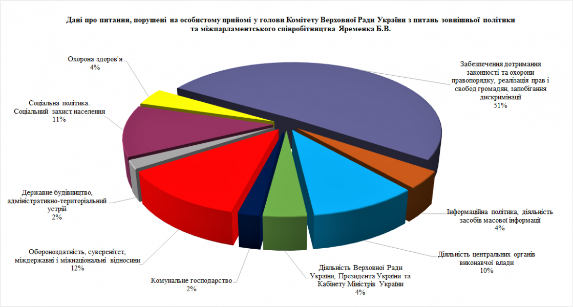 Під час особистого прийому відвідувачі порушили 51 питання, найактуальнішими з яких були такі: забезпечення дотримання законності та охорони правопорядку, реалізації прав і свобод громадян, запобігання дискримінації; соціальної політики та соціального захисту населення; обороноздатності, суверенітету, міждержавних і міжнаціональних відносин; діяльності центральних органів виконавчої влади.