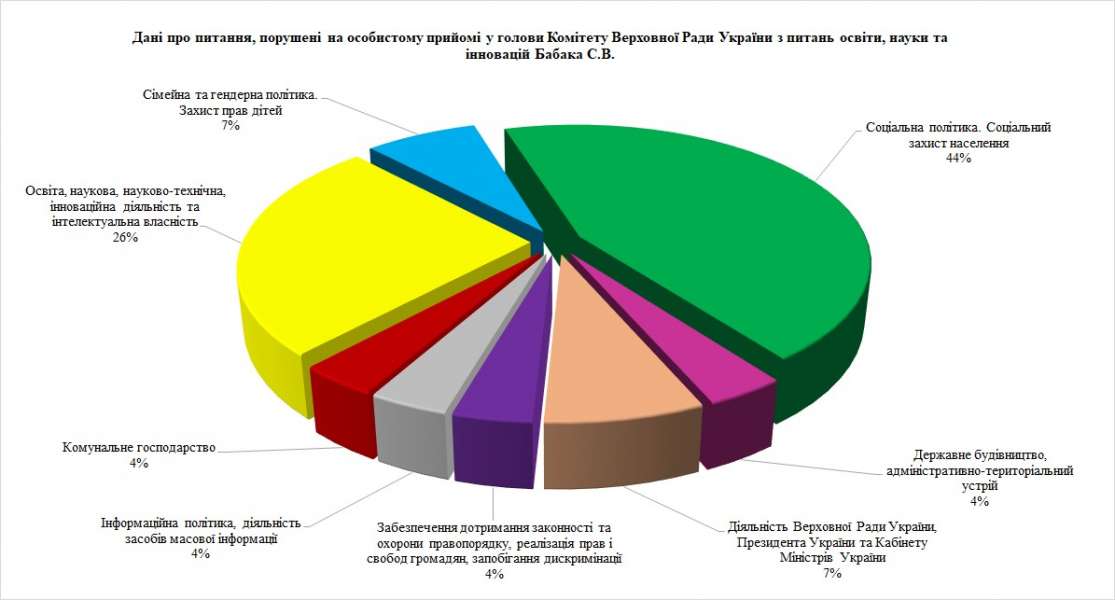 Під час особистого прийому відвідувачі порушили 27 питань, найактуальнішими з яких були питання: соціальної політики та соціального захисту населення; освіти, наукової, науково-технічної, інноваційної діяльності та інтелектуальної власності.