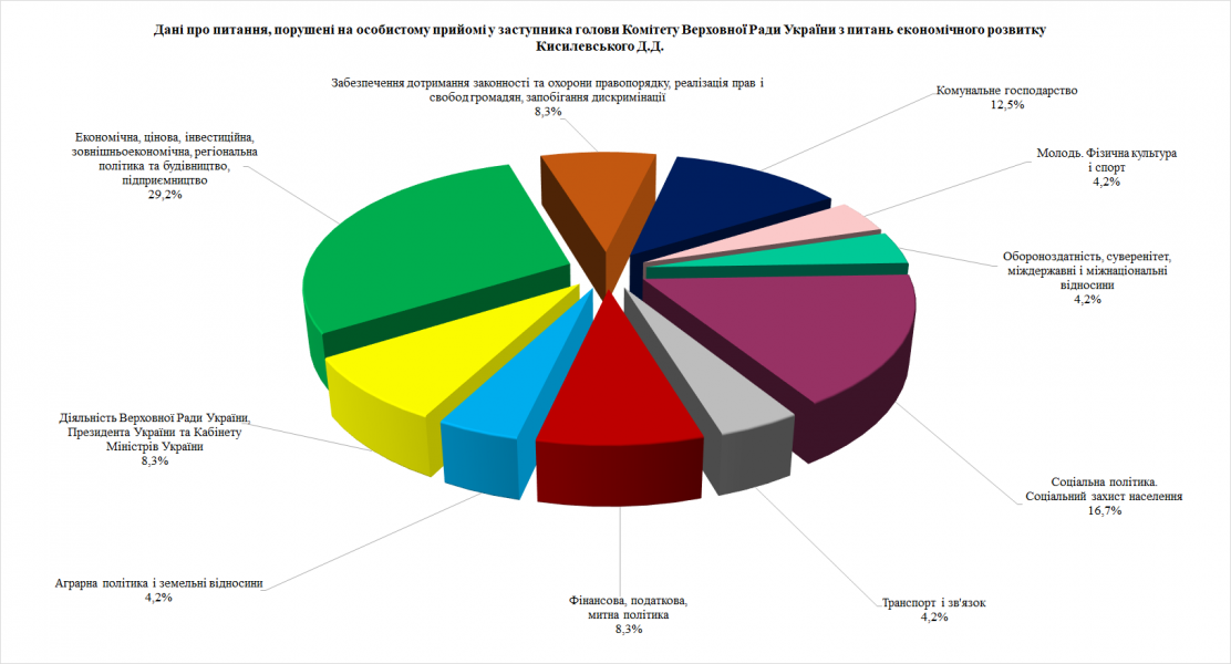 Під час особистого прийому відвідувачі порушили 24 питання, найактуальнішими з яких були питання: економічної, цінової, інвестиційної, зовнішньоекономічної, регіональної політики та будівництва, підприємництва; соціальної політики та соціального захисту населення; комунального господарства.